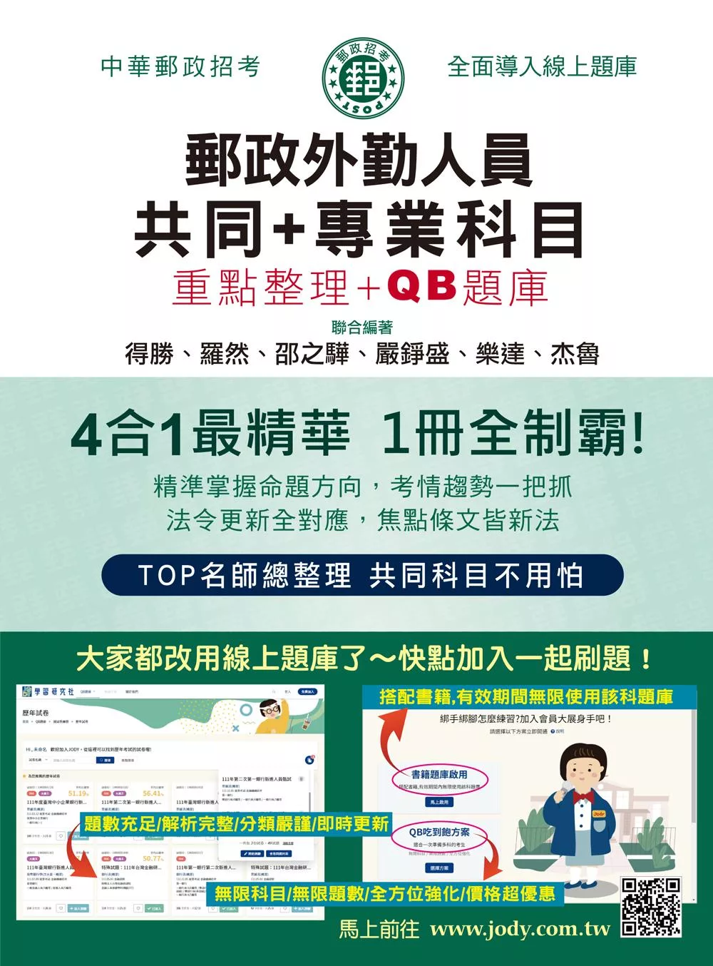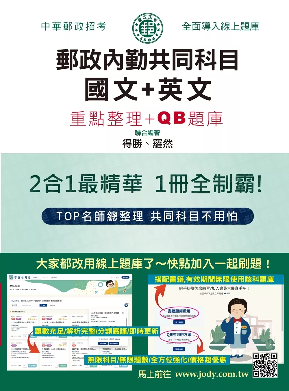 功能強大的線上題庫jody.com.tw。除將歷年題庫(QB)全面數位化外,更進一步導入「數據分析」技術→透過你的作答歷史,從各個重要維度(章節/題型/屬性/關鍵字…等)進行統計分析,用最客觀的數據告訴你各科應重點加強的弱項。有了數據輔助,備考就不再是無頭蒼蠅,還能親眼見證自己愈變愈強,超有成就感!!