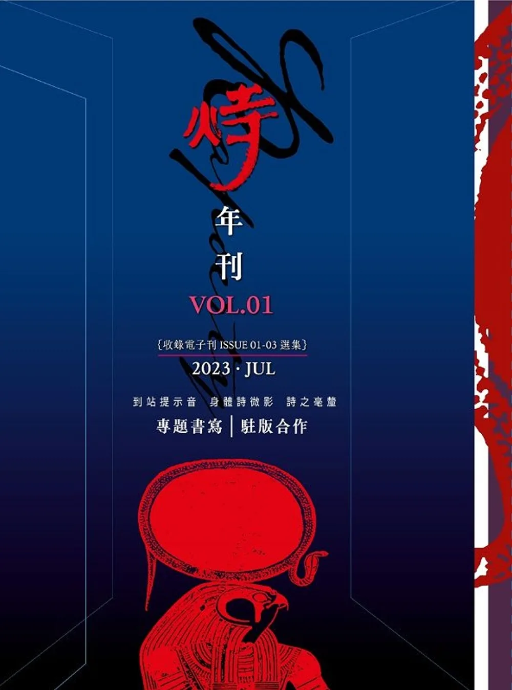 第二本年刊在駐版合作方面共加入了兩個元素。其一是由詩人�建築師雙重身分的不清為火寺所撰寫的專欄,探討建築美學與詩的關聯及其延伸。據我所知有不少詩人來自建築的背景,相信這個專欄能帶給讀者們在寫作上與鑑賞上不同的思考方向與激盪。另一個加入火寺駐版合作的是「YIPING:不存在的詩展」團隊,由他們每期選出一首詩來進行策展,並在IG平台上展出。這兩個駐版合作的加入,彷彿也與一整年度的「空間三題:地、空、之間」主題緊密呼應。除了空間三題,我們特別加開了「身體自主」主題單元來回應當前的社會議題。而在年刊封面的設計上,我們也加入了空間的元素,希望讓整本刊物更具有空間感。打開火寺,如同走入詩的宮殿,我們各自以不同的角度,看見古埃及太陽神祇的真知、神聖之眼。